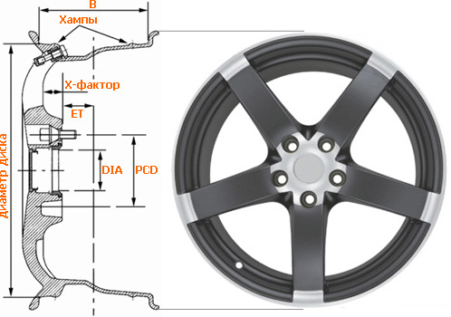 Расстояние между привалочной плоскостью и задней стороной диска и называется "х-фактором". Это понятие достаточно условное. Конструкция обода регламентируются стандартами, поскольку необходимо обеспечить посадку на обод пневматической шины, конструкция же диска достаточно свободна. В то же время, она должна обеспечить совместимость с тормозными элементами, необходимую прочность колеса и привлекательный внешний вид.